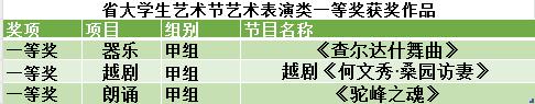 在榮獲一等獎的6件作品中,袁寬城演奏的二胡獨奏《查爾達什舞曲》、湯俊演唱的越劇《何文秀·桑園訪妻》、劉茂宇等4位同學表演的朗誦《駝峰之魂》獲得藝術表演類一等獎;項夢婷的書法篆刻作品《元詩四首》、陳亮的書法篆刻作品《我的中國夢·安居》以及陳文昕等48人共同創作的微電影《放飛·青春》獲得藝術作品類一等獎。