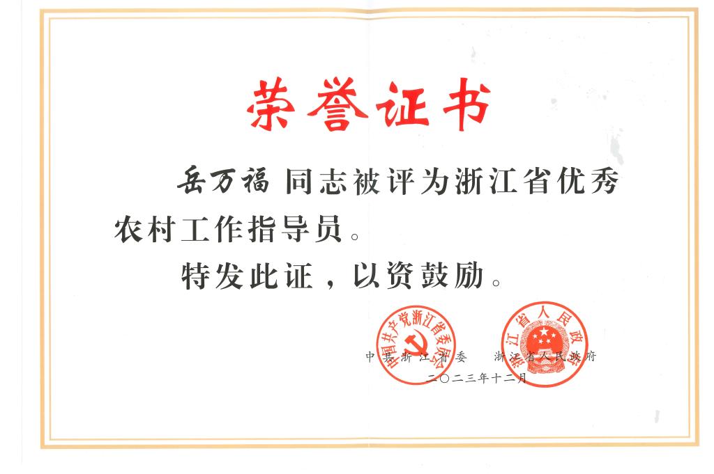 近日,中共浙江省委、浙江省人民政府聯合印發《關于表彰浙江省農村工作指導員先進單位和優秀農村工作指導員的通報》。我校動科動醫學院岳萬福教授獲評“浙江省優秀農村工作指導員”,這也是岳萬福第四次榮獲省級獎勵。