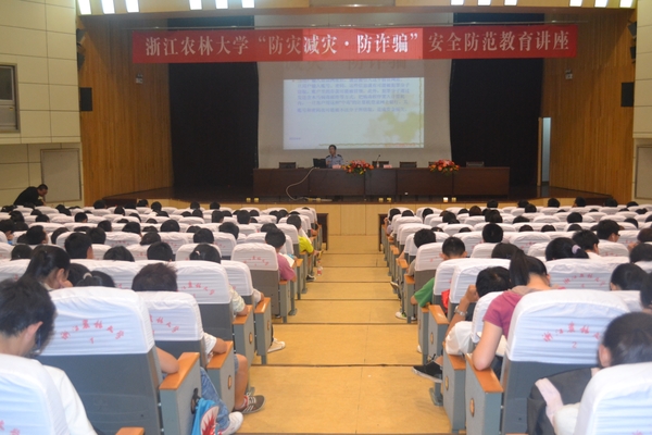 浙農林大新聞網訊 5月9日晚上,在圖書館第一報告廳舉行了“防災減災·防詐騙”安全防范教育講座。保衛處長馬小輝主持并講話,講座由錦城派出所中隊指導員呂清良主講,各學院輔導員、保衛處綜合科、治安科負責人及600余名學生參加了講座。