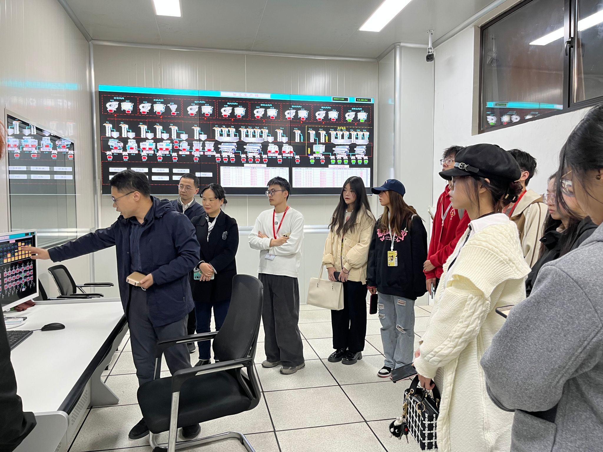 在供應商負責人的帶領下,學生代表們先后參觀了食用油和大米的倉庫、生產車間、檢測中心等關鍵生產區域。大家被數字化管理系統所吸引,通過大屏幕實時查看生產數據,了解數字化管理系統如何精準控制食材采購、加工、檢測等全流程,以及智能機器人如何高效、準確地完成重物搬運、精確分揀等任務。從原料入庫到產品出庫,每一個環節都通過數字化手段進行精準控制,確保了食材來源的清晰可追溯。