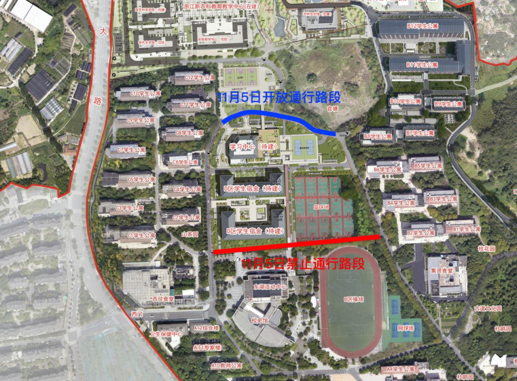 活動中心北面道路封閉(紅色標注道路),C11東面至B8西面道路臨時開放通行(藍色標注道路),具體路段詳見下圖。