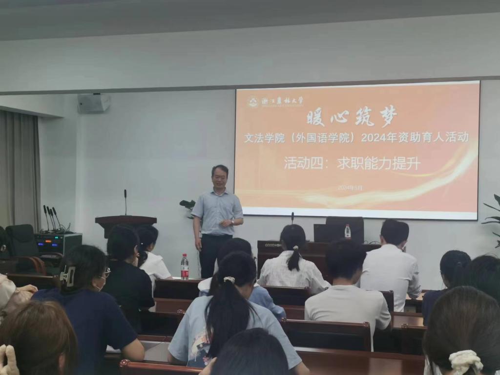 5月30日晚,文法學院“暖心筑夢”資助育人系列活動之求職能力提升培訓在衣錦校區實驗樓502舉辦,學院黨委書記朱紅東及學院相關負責人,中國語協演講口才協會副秘書長、校“同伴”語言工作室教師嚴景城,資助管理輔導員及學生資助對象代表參加活動。