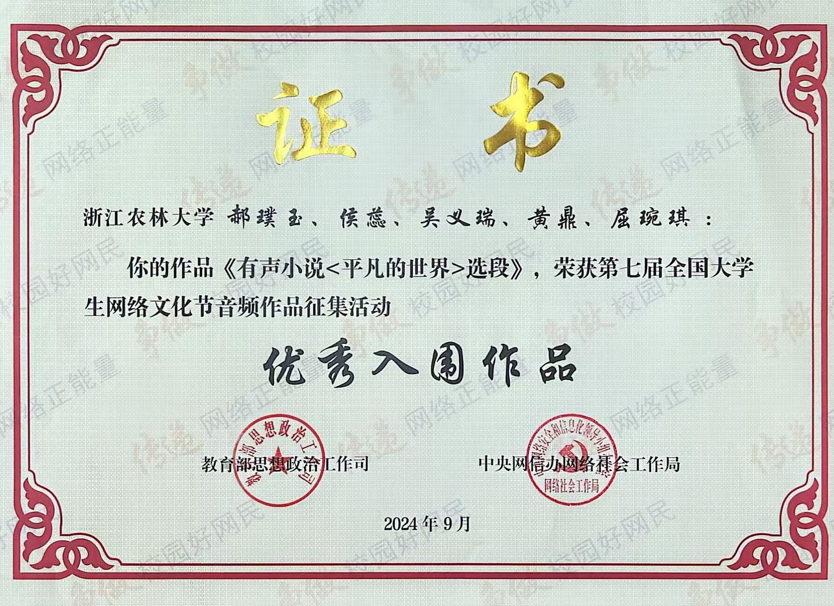 近日,由教育部思想政治工作司與中央網信辦網絡社會工作局共同主辦的第七屆“全國大學生網絡文化節”結果揭曉。我校新聞中心指導、學生通訊社廣播電臺創作的《有聲小說<平凡的世界>選段》榮獲優秀入圍作品。