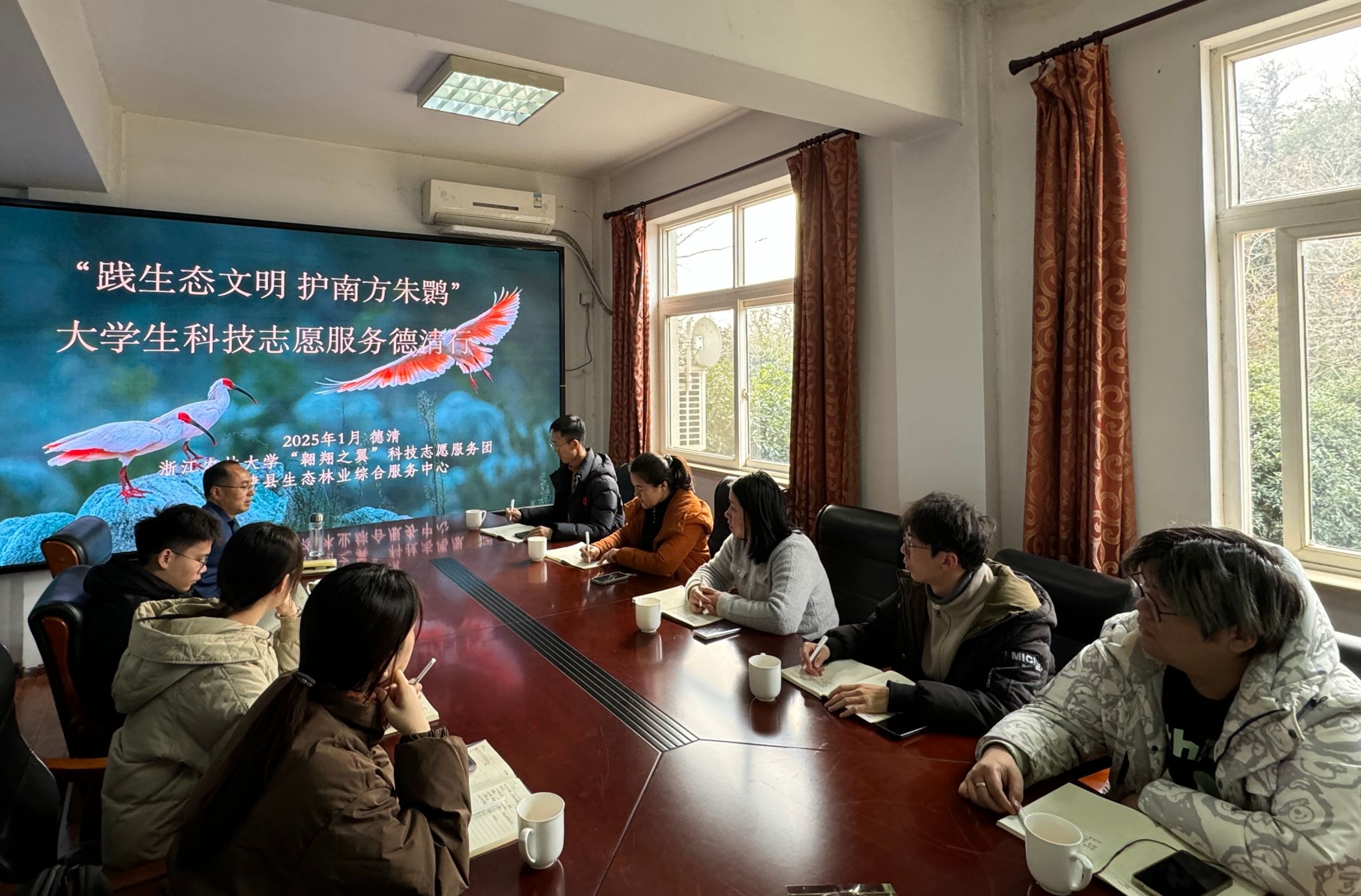 1月20日,動科動醫學院“踐生態文明,護南方朱鹮”師生志愿服務團隊的9位核心成員,在學院黨委書記魏玲玲的帶領下,赴浙江省朱鹮搶救保護基地中心開展座談調研,深入討論朱鹮保護科技志愿服務的內容和需求。