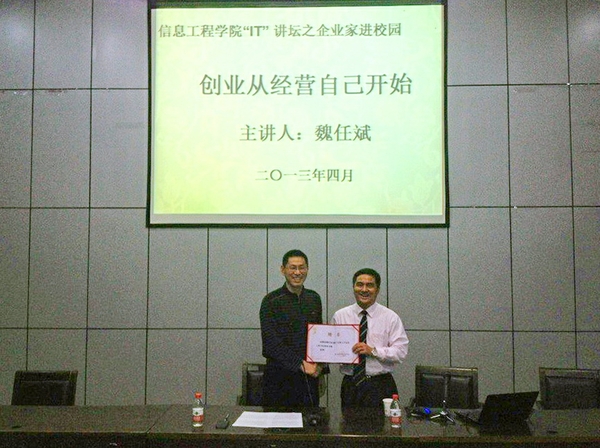 浙農林大新聞網訊  4月26日晚,杭州飛來投資管理有限公司董事長、杭州創業服務網CEO魏任斌應邀參加信息工程學院“IT講會”之“企業家進校園”活動。活動中,魏任斌為廣大師生做了題為《創業從經營自己開始》的精彩講座,并受聘為信息工程學院創業導師。活動由信息學院黨總支書記汪和生主持。