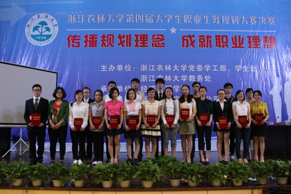 浙農林大新聞網訊  9月22日下午,校第四屆大學生職業生涯規劃大賽決賽在東湖校區圖書館第一報告廳舉行。本次大賽由學生處和教務處主辦,經濟管理學院承辦,并得到了浙江聯譽實業有限公司大力支持。校黨委學工部部長、學生處處長繆魯加、保衛處處長馬小輝、浙江大學人事處副處長朱慧、浙江經貿職業技術學院招生辦主任姚華兒以及教務處、各二級學院相關負責人出席活動。