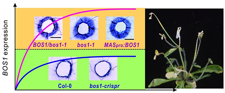 植物在抗病和發育過程中,通過細胞程序性死亡的啟動,來形成一個死亡區域。該區域可以是一片細胞死亡的病斑,從而將病菌限制在病斑中,避免病害擴散;也可以是幾層細胞死亡,形成導管或花藥的開裂層,是完成植物生命活動的必要環節。細胞死亡研究的難點在于死亡時間點的不可控性,研究中常用光、病菌來誘導細胞死亡,無法精確的預測死亡的時間和地點,只能在細胞死亡出現后,研究一些后期的表型。本研究發現了一個轉錄因子BOS1,可以在高表達時啟動細胞死亡程序,通過外傷激活表達的誘導表達株,文章成功在葉片傷口的周圍誘導出持續的細胞死亡面積,實現了哪里有外傷哪里就有細胞死亡發生,實現了細胞死亡時間和地點的精確控制。