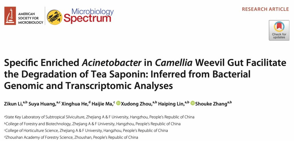 近日,國家重點實驗室周旭東教授團隊以“Specific EnrichedAcinetobacterinCamelliaWeevil Gut Facilitate the Degradation of Tea Saponin: Inferred from Bacterial Genomic and Transcriptomic Analyses”為題在國際知名學術雜志Microbiology Spectrum(IF2021= 9.043)發表最新研究成果,從多組學角度和分子水平初步揭示了不動桿菌AS23幫助茶籽象降解植物有毒PSM茶皂素的作用,為深入理解植物-昆蟲-微生物相互作用機制提供了進一步的依據。
