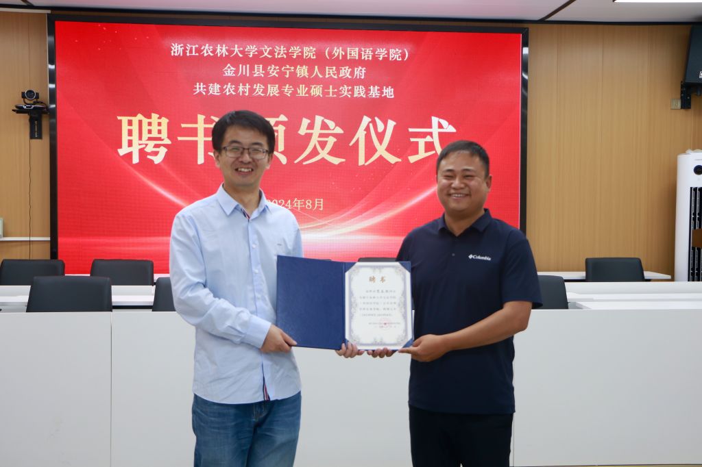 會上,文法學院與金川縣安寧鎮人民政府共建農村發展研究生實踐基地,并聘請賀菡松、田洋為實務導師。全國學雷鋒活動示范點浙江農林大學“雷鋒班”在安寧鎮建立實踐基地。