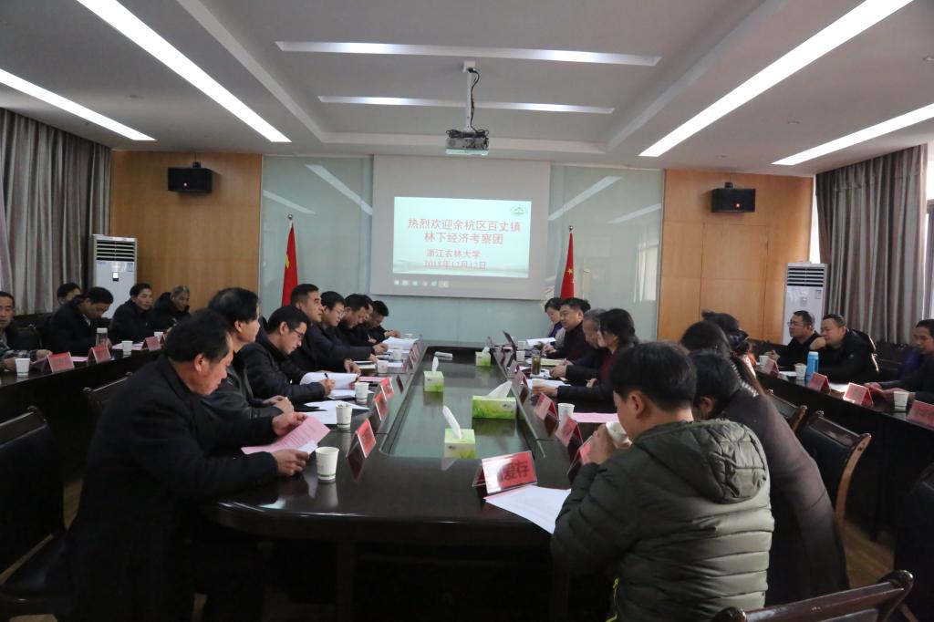 近日,余杭區林水局、農業局、百丈鎮農業公共服務中心人員和百丈鎮林下經濟示范戶一行22人來我校,洽談林下經濟合作事宜并舉行座談,林生院、社會合作處相關負責人及中藥學科骨干教師參加座談。